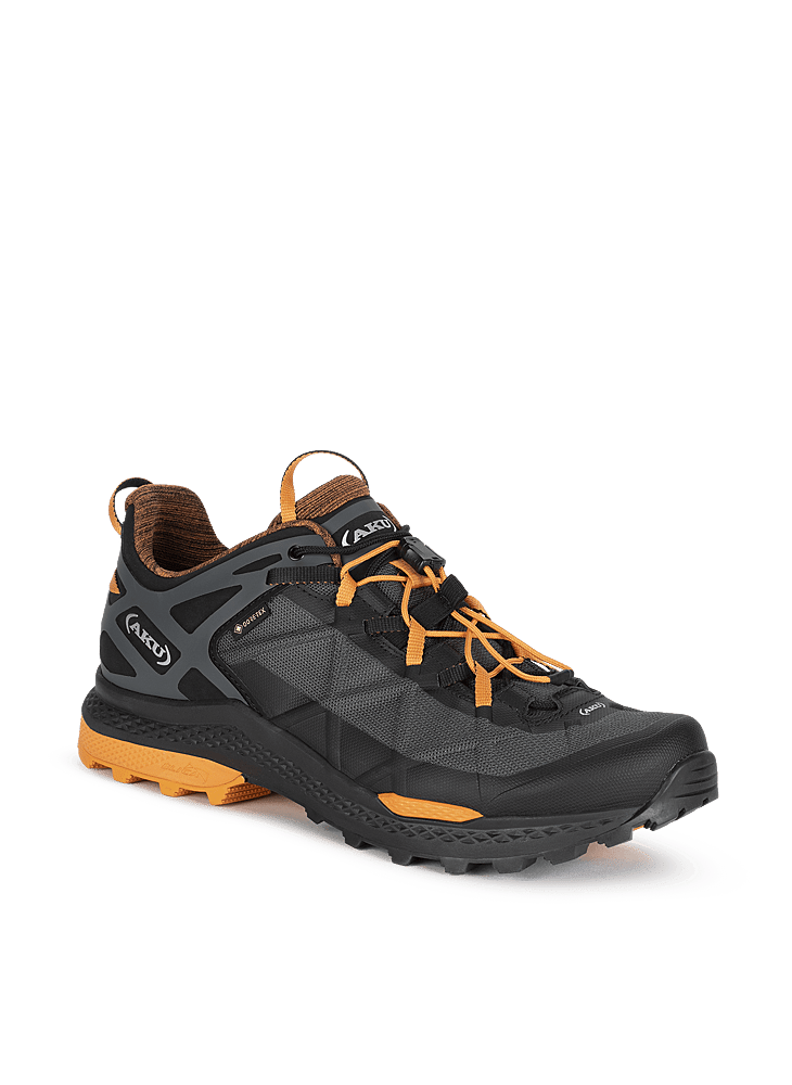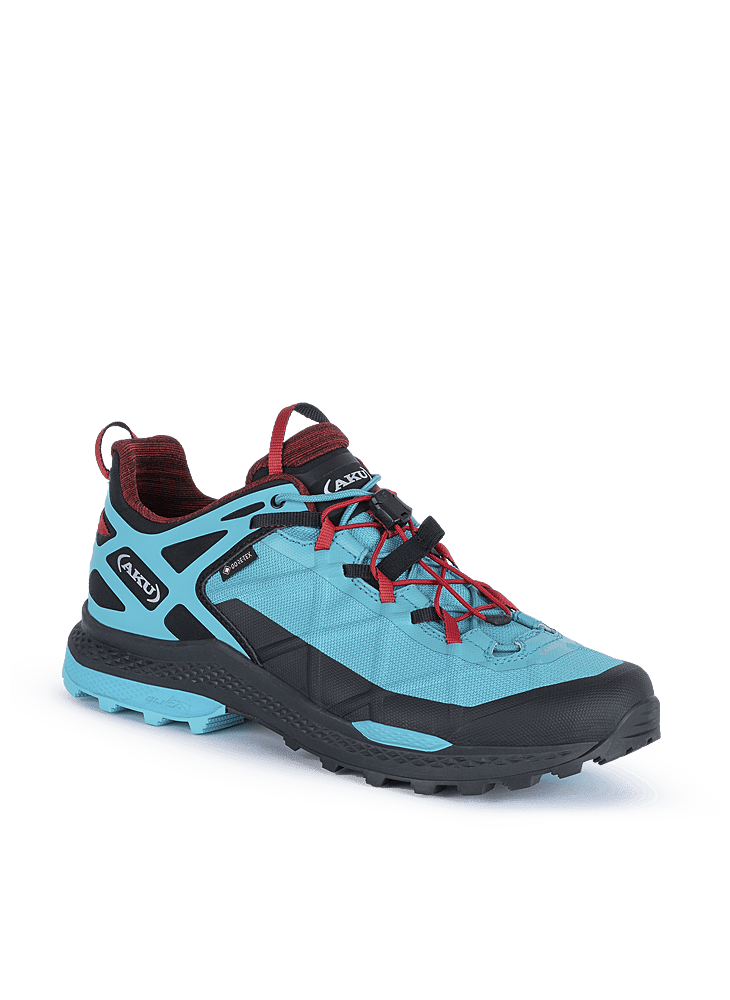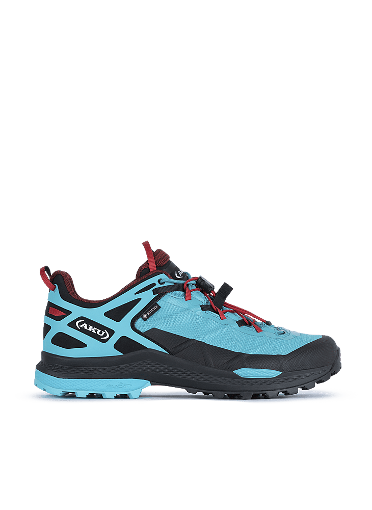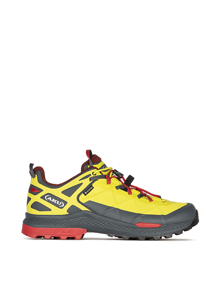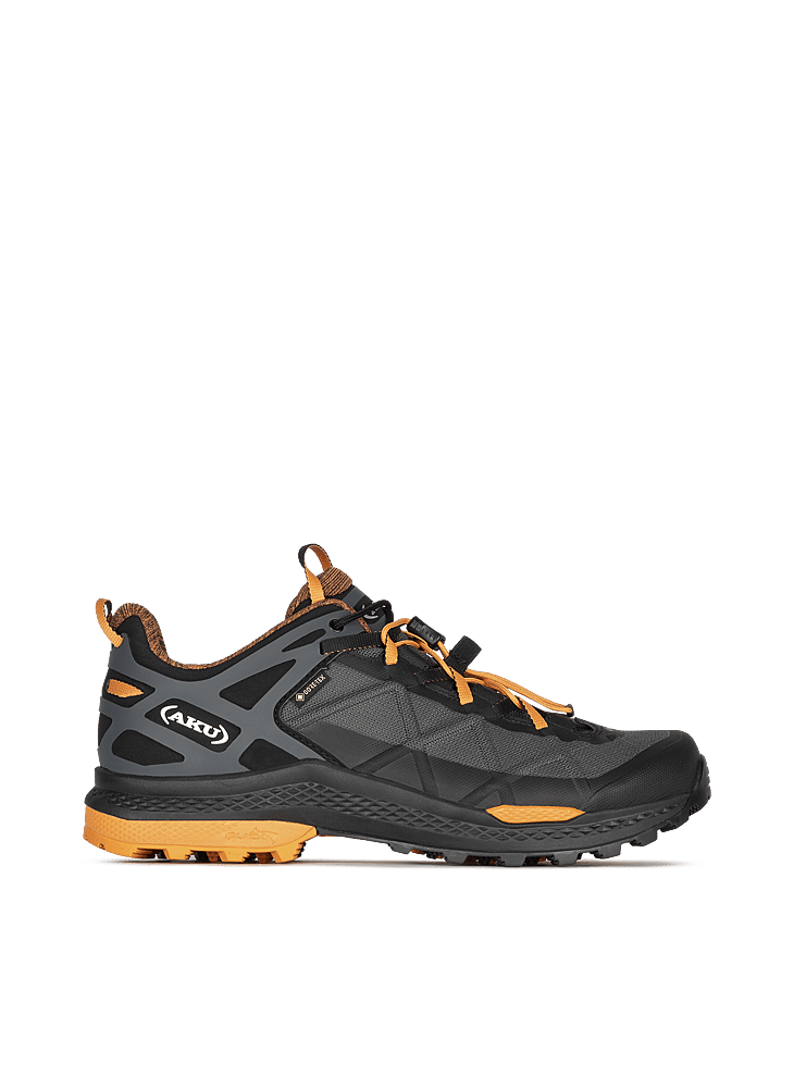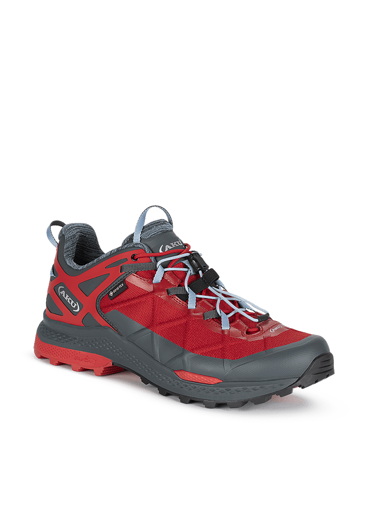 Snelle wandelschoen, dynamisch en betrouwbaar, zelfs op de moeilijkste trails. Rocket DFS GTX maakt gebruik van de innovatieve Vibram Traction Lug-technologie die de tractie en grip met 25% verbetert dankzij het speciale ontwerp. Het bovenwerk heeft een gekruiste ribstructuur en wordt beschermd door een 3D-printlaag. Met de exclusieve AKU Dual Fit System (DFS) technologie, hier gerealiseerd in de versie voor snelwandelen, kun je de mate van precisie van de pasvorm variëren door eenvoudigweg in te werken op de twee verschillende vetersystemen. Het is gebouwd met AKU Elica Natural Stride System technologie om biodynamische efficiëntie te bevorderen.