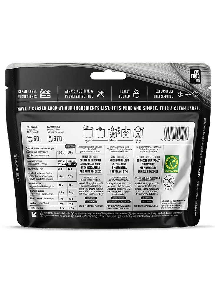 Het maakt niet uit of je klimt, wandelt, fietst of hardloopt - je komt niet ver zonder een voedzame en voedende maaltijd. Word sterker als Popeye en ga zo ver als je wilt. Broccoli, spinazie, mozzarella en pompoenpitten - we hebben al het goede verpakt in een klein, lichtgewicht LYO-ritszakje. Het is lekker, bevredigend en klaar voor avontuur!
