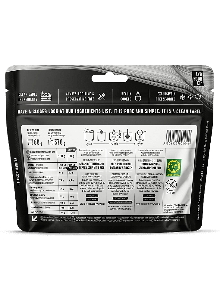 Tomatenpulp (tomaten, tomatensap) 30%, rijst 26%, rode paprika 15%, zure room, ui, tomatenpuree 8%, zout, suiker, kruiden.