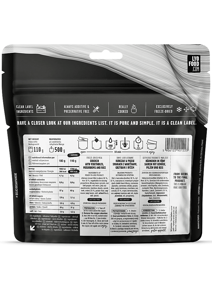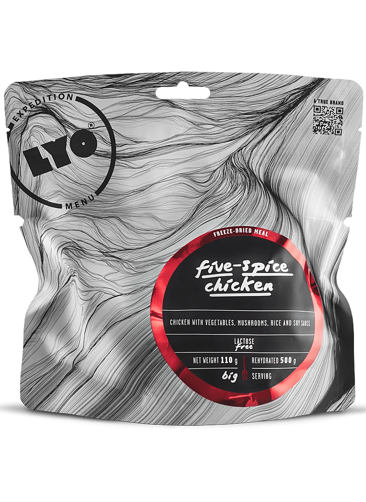 Waarom is LYO Five-Spice Chicken het uitproberen waard? Ten eerste, wat een mix is dit! Bamboescheuten, mungbonen, gelei-oorzwammen en sojasaus worden gecombineerd met rijst, sappige stukjes kipfilet en groenten die herinneringen oproepen aan je favoriete Chinese restaurant. Ten tweede zou het niet zo lekker zijn als het niet op een echte manier was bereid! Voor het vriesdrogen koken we onze maaltijden in kleine batches, zodat ze hun heerlijke en authentieke smaak behouden. Voor die lange en slopende dagen in de buitenlucht is LYO Five-Spice Chicken de perfecte brandstof om je op de been te houden.