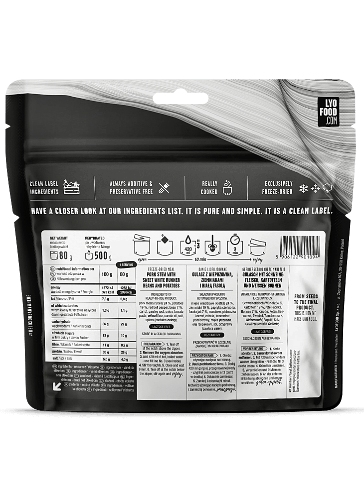 Varkensvlees (blokjes) 24 %, aardappelen 19 %, rode paprika, bonen 7 %, wortel, peterseliewortel, ui, tomatenpuree, tarwebloem, canolaolie, zout, kruiden (bevat selderij).