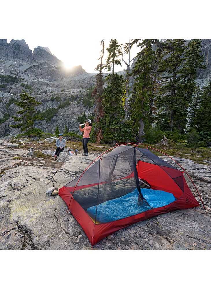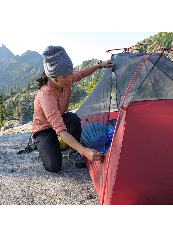 De binnenkant: 226 g lichter dan de vorige FreeLite, hij heeft nog steeds de echte rechthoekige vloer (geen taps toelopende voeten zoals de meeste andere tenten) en een meter hoofdruimte, 7,6 cm meer dan voorheen. De micromesh tentromp zorgt voor uitstekende ventilatie en heeft een waterdichte badkuipachtige vloer ter bescherming tegen de elementen. Twee tentdeuren zonder kromming voorkomen dat u midden in de nacht over uw tentpartner heen moet kruipen en zijn voorzien van nieuwe ritsen die duurzamer zijn en gemakkelijk met één hand te bedienen. Ze sluiten ook op één punt zodat u altijd weet waar u de deur moet openen, zelfs in het donker. Nieuwe technologievriendelijke zakken hebben kabelopeningen in de hoeken voor koptelefoon- en oplaadsnoeren. De vakken boven het hoofd zijn perfect voor hoofdlampen, zonnebrillen en andere snel toegankelijke spullen.