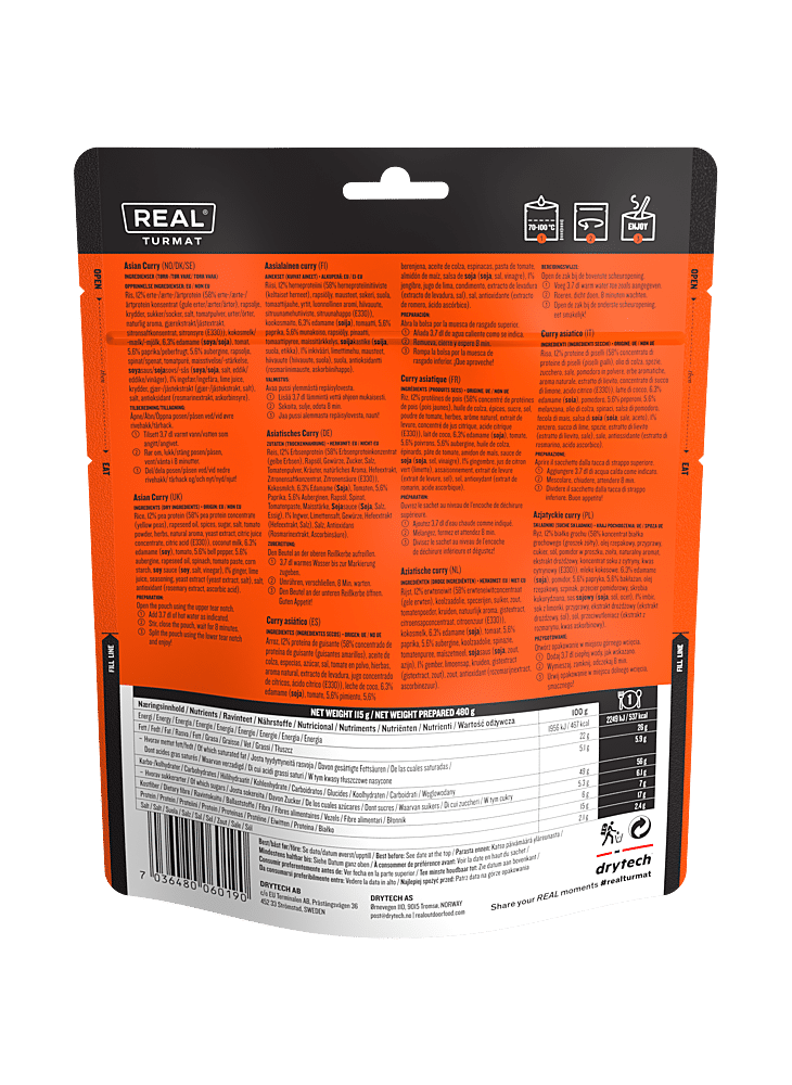 Rijst, erwteneiwit (erwteneiwitconcentraat (gele erwten) (58%), raapzaadolie, specerijen, suiker, zout, tomatenpoeder, kruiden, natuurlijk aroma, gistextract, citroensapconcentraat, citroenzuur (E330)) (12%), kokosmelk, edamame (soja) (6 , 3%), tomaat, paprika (5,6%), aubergine (5,6%), raapzaadolie, spinazie, tomatenpuree, maïszetmeel, sojasaus (soja, zout, azijn), gember (1%), limoensap, kruiden, gistextract (gistextract, zout), zout, antioxidant (ascorbinezuur).