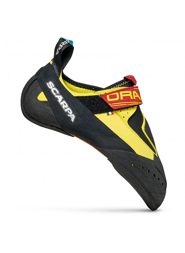 De Drago is agressief naar beneden gedraaid en zeer asymmetrisch, met een voorvoet omwikkeld met kleverig rubber, en vertegenwoordigt het summum van rockschoenconstructie - gespecialiseerd, zorgvuldig vervaardigd en verfijnd om op het hoogste niveau te presteren op veeleisende boulders en steile sportroutes.