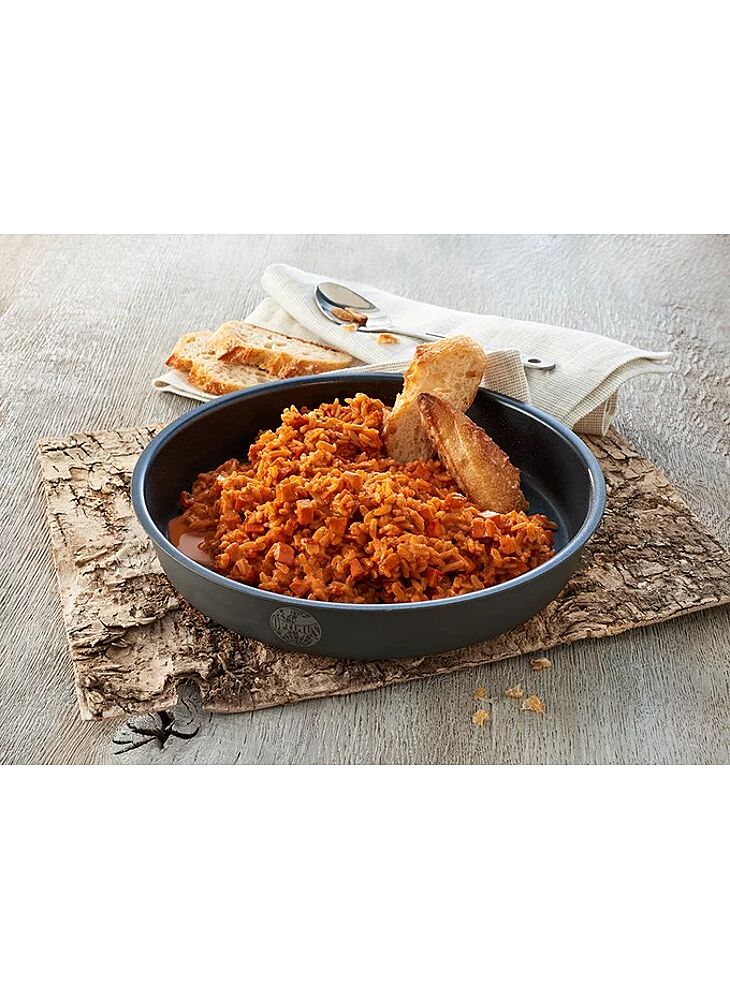 Kip tikka masala Ingrediënten: langkorrelrijst, kippenvlees 15%, zonnebloemoliepoeder (bevat melk, E551), tomatenpoeder, kruidenmix (bevat selderij), wei-eiwitconcentraat, gemodifi ceerd zetmeel, aardappelmeel, maltodextrine, uien, tomaten, gistextract, peterselie, gember, paprika, zout, chilipoeder, knofl ookpoeder, peper, natuurlijk aroma. Droog vleesgewicht: 22 g (komt overeen met ca. 78,7 g vers vlees). Bereiding: Vul de zak met kokend water tot 8 cm op de vullijn (320 ml), goed roeren, zak afsluiten en 8 min. laten wellen. Allergenen: melk, selderij