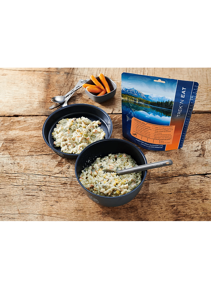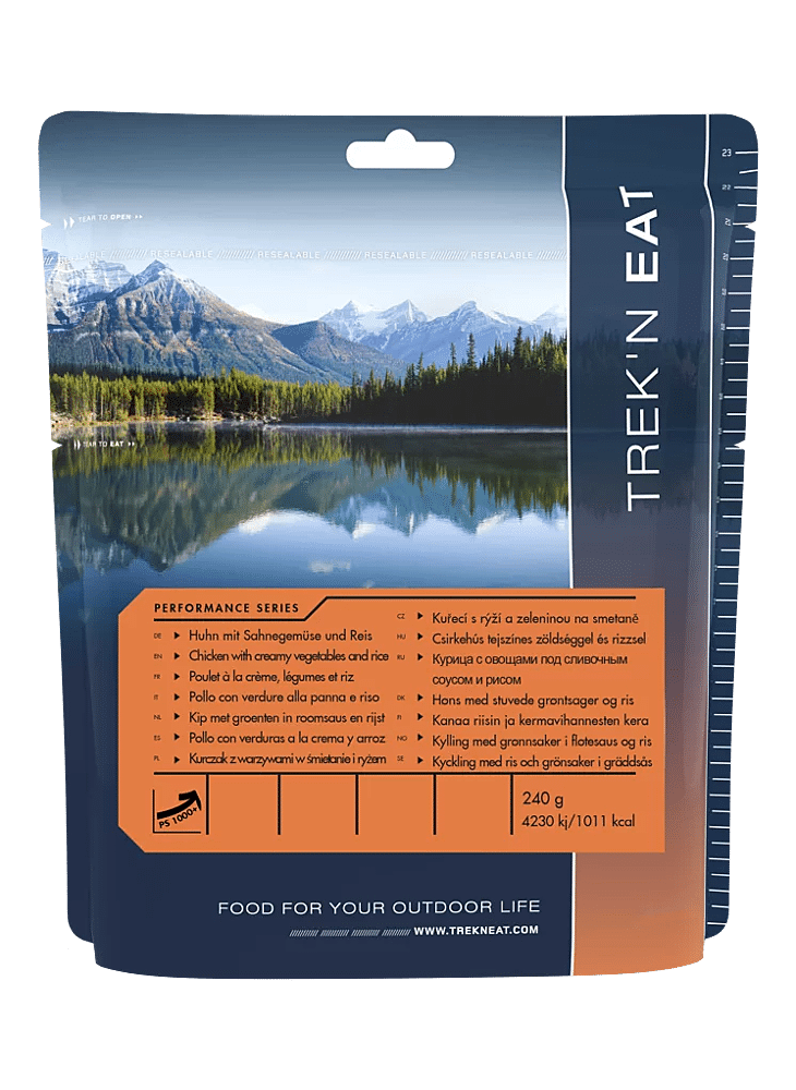 Met 1011 kcal levert dit romige rijstgerecht ook de nodige energie voor fysieke inspanningen in de natuur en scoort het met waardevolle eiwitten en vitaminen. Wat thuis kipfricassee wordt genoemd, wordt door Trek'n Eat geserveerd als een heerlijke maaltijd voor onderweg, die in een paar eenvoudige stappen wordt bereid en het lichaam voorziet van langdurige voedingsstoffen.