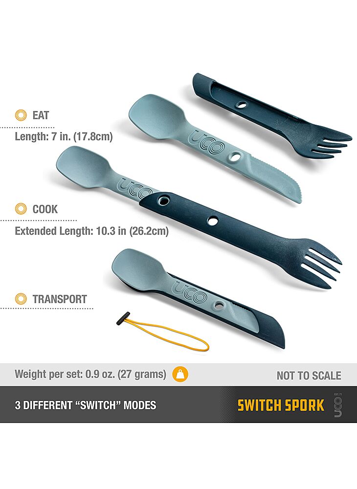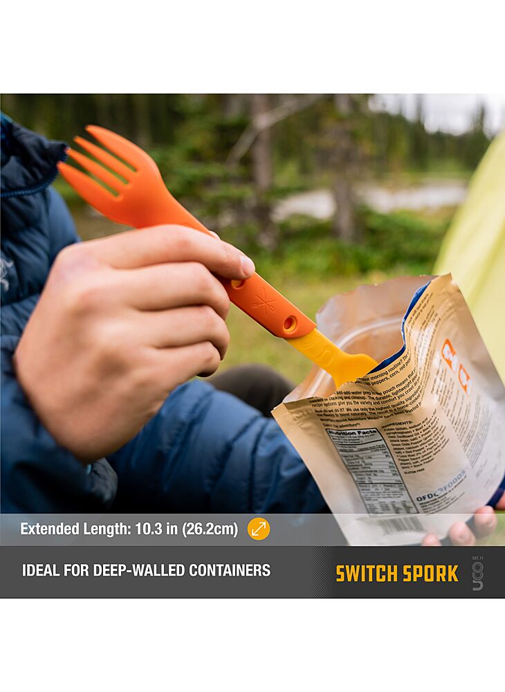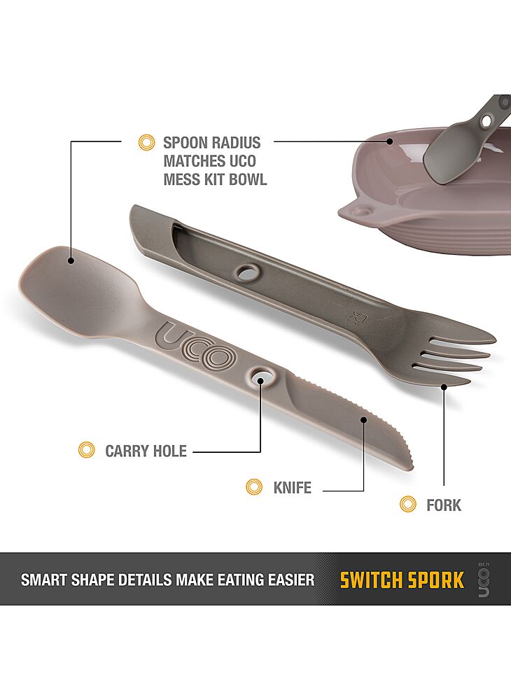 De Switch Spork is het ultieme vormveranderaar: compact op te bergen maar transformeert in een lepel, vork en mes, of telescopeert in elkaar tot een extra lang bestek, ideaal voor diepwandige containers zoals gevriesdroogde maaltijden in zakjes. Of u nu gaat wandelen in de Cascades, picknicken op het strand of tanken op kantoor, UCO sporks maken maaltijden buitenshuis aangenamer. UCO Ware heeft een beperkte levenslange garantie.